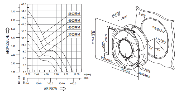| MODEL | Bearing Type | Rated Voltage | Operating Voltage Range | Rated Current | Rated Input Power | Speed | Maximum Air Flow | Maximum Air Pressure | Acoustic Noise | Life expectancy | |||