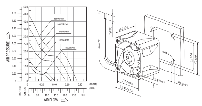 MODEL Bearing Type Rated Voltage Operating Voltage Range Rated Current Rated Input Power  Speed Maximum Air Flow   Maximum Air Pressure  Acoustic Noise  Life expectancy