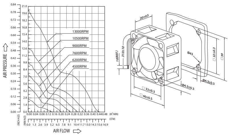 | MODEL | Bearing Type | Rated Voltage | Operating Voltage Range | Rated Current | Rated Input Power | Speed | Maximum Air Flow | Maximum Air Pressure | Acoustic Noise | Life expectancy | |||